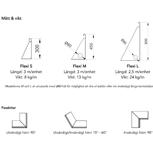 Våra standardprofiler säljs i höjderna 30 cm, 45 cm & 80 cm med tillhörande passbitar för att sömlöst kunna binda ihop kantstöden i olika vinklar och/eller anslutas mot befintlig vägg eller mur.